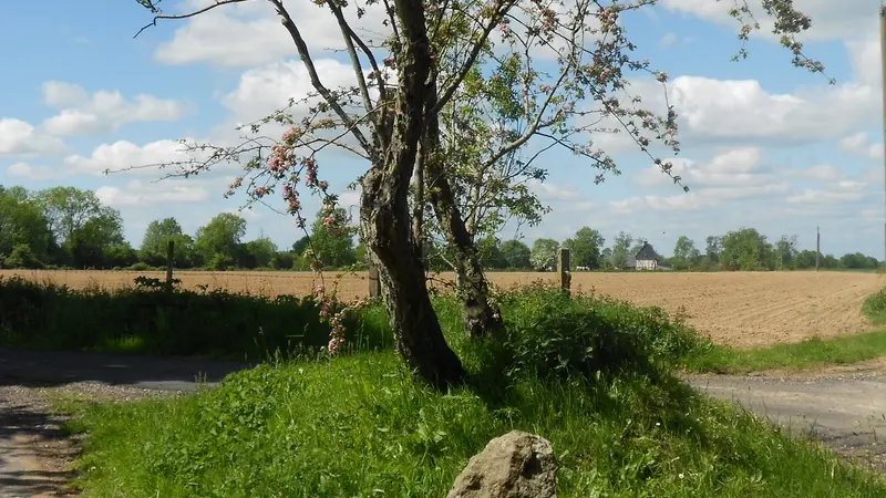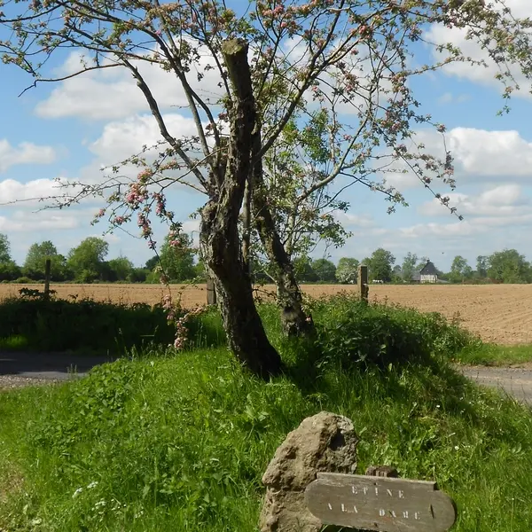 4. Emprunter le chemin à gauche avant la dernière habitation. Continuer toujours tout droit par le chemin herbeux jusqu’à la D4. Longer la route à droite sur 200m, traverser et emprunter le chemin en bord de culture. Franchir un portique en bois pour rejoindre le chemin. Laisser le premier chemin sur la gauche et rejoindre le croisement de l’Epine à la Dame.