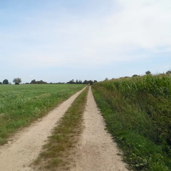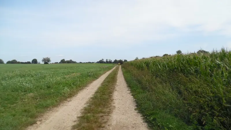 2- En face de la chaumière, emprunter le chemin de terre à droite qui borde une exploitation agricole. Poursuivre à travers les champs du plateau sur le sentier herbeux. Au croisement d’un chemin poursuivre à droite, puis à gauche de la haie entre les cultures (chemin dissimulé). Arrivée à une petite route, maintenir votre itinéraire sur la droite dans le petit sentier puis à gauche dans le premier chemin.