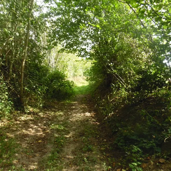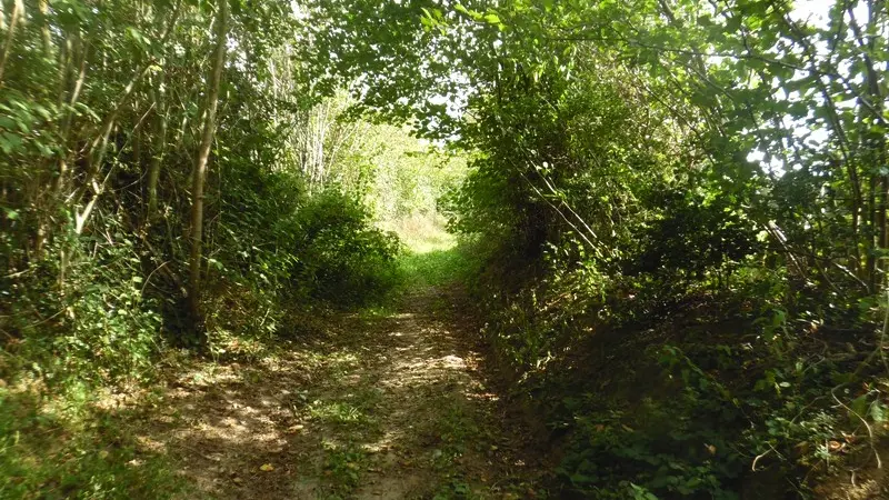 3- Arrivé sur une route, s’engager en face dans le sentier. Suivre un virage sur la droite bordé d’habitations et continuer tout droit dans ce chemin qui se rétrécit. Au lieu-dit « la Perdrielle », tourner à gauche après un virage. Longer les cultures jusqu’à une intersection de chemins et tourner à droite sur le chemin empierré.