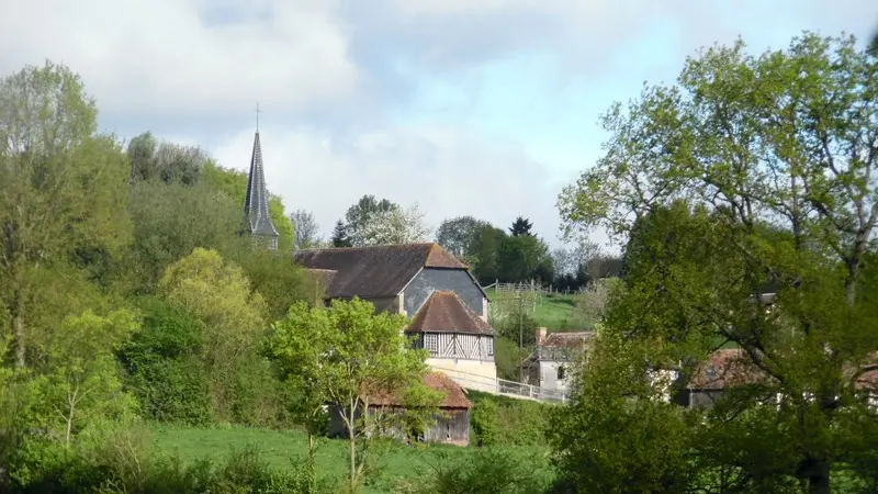 4 A la vierge, suivre la D 40 pour tourner à gauche 50 m plus loin vers l’église d’Ecots sur la D250. Passer l’Oudon et tourner à droite. Contourner la ferme par la gauche pour s’engager dans le chemin entre 2 haies. Après 2 virages successifs, celui-ci rejoint une petite route goudronnée qui serpente jusqu’à l’église de St Martin de Fresnay. Au carrefour, tourner à gauche.